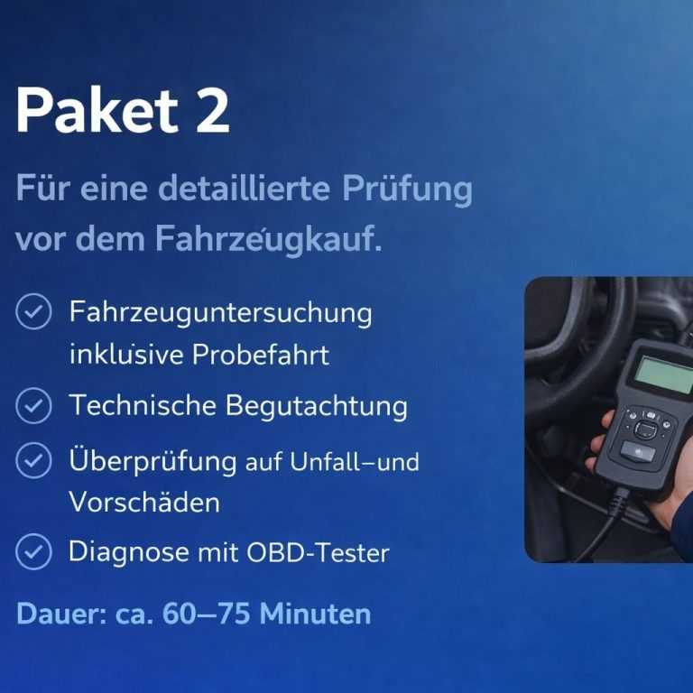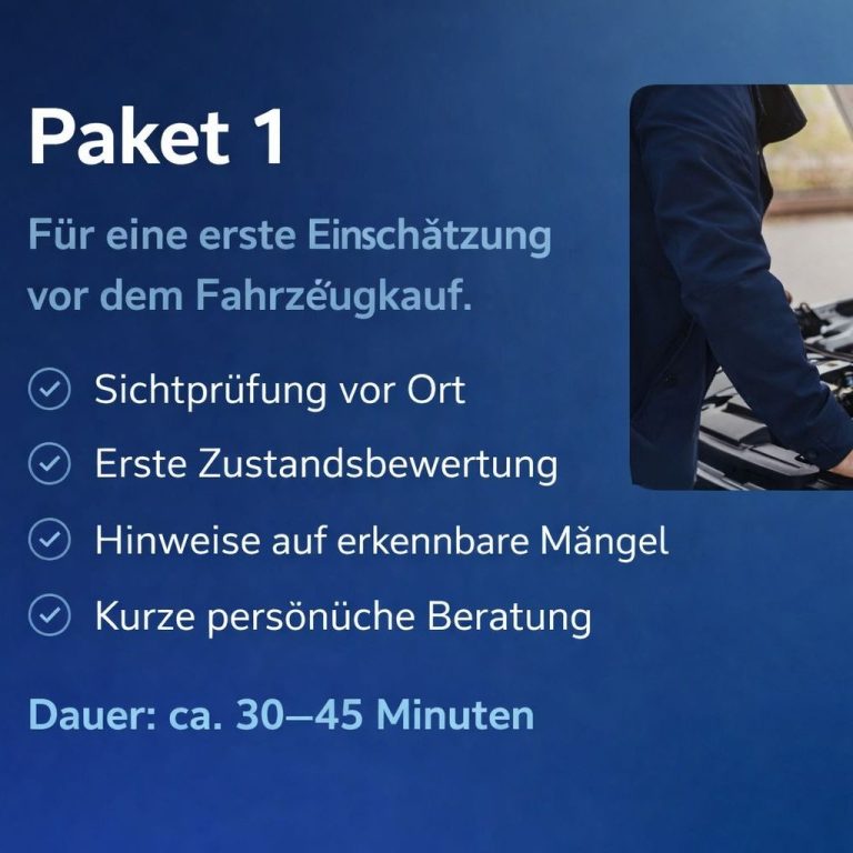 Bei der Besichtigung vor Ort wird das Fahrzeug mit fachlichem Blick auf Zustand, sichtbare Mängel, mögliche Unfallschäden und allgemeine Auffälligkeiten eingeschätzt. So erhalten Sie eine bessere Grundlage für Ihre Kaufentscheidung und mehr Sicherheit vor dem Abschluss.