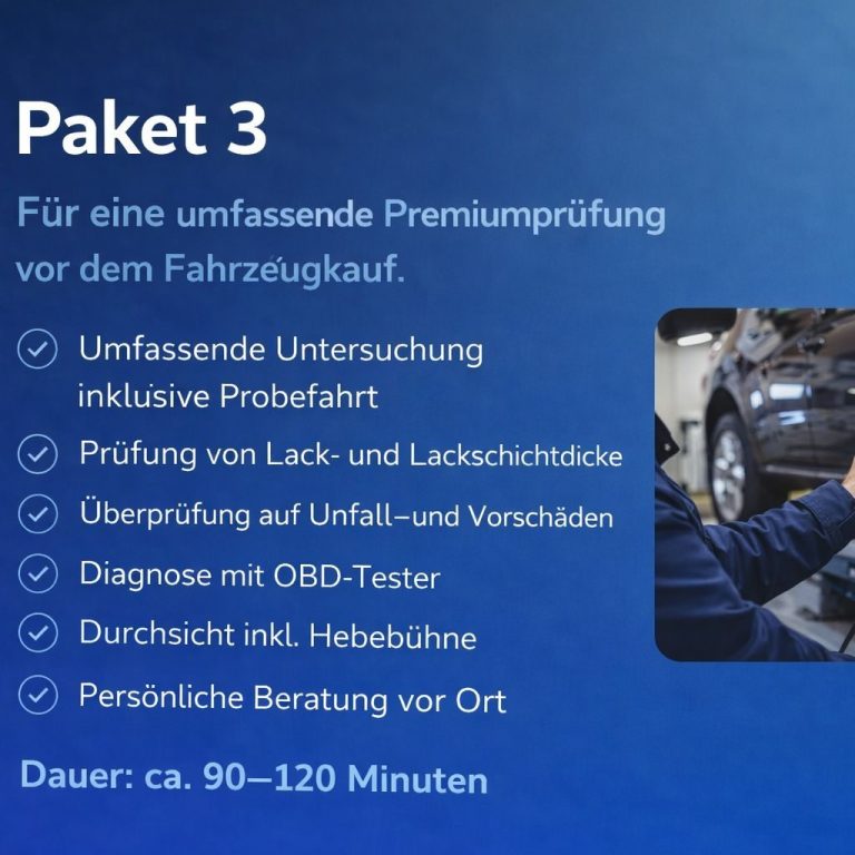 Bei der Besichtigung vor Ort wird das Fahrzeug mit fachlichem Blick auf Zustand, sichtbare Mängel, mögliche Unfallschäden und allgemeine Auffälligkeiten eingeschätzt. So erhalten Sie eine bessere Grundlage für Ihre Kaufentscheidung und mehr Sicherheit vor dem Abschluss.